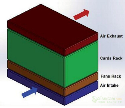 冷卻系統(tǒng)的組織,是為了使其符合機架供應(yīng)商的標(biāo)準(zhǔn)。如圖1所示,其顯示了我們最終的設(shè)計草圖。進氣口是在前端的底部,而空氣的排出口是在頂部的背面或頂部。空氣流是從機架的底部流到頂部。最小空氣流量為每秒0.2立方米(m3/s)或420立方英尺每分鐘(cfm)。這一空氣流被定義了,以便該系統(tǒng)將能夠與現(xiàn)有的卡和機架向后兼容。機架的大小被固定在大約0.4 m x 0.44 m x 0.25 m (H x W x D),這意味著系統(tǒng)中的空氣每秒將被替換約四次。