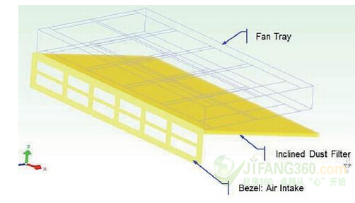 保持過濾器與風(fēng)扇的平行是一大擁有其主要優(yōu)勢的選擇:過濾器的提取非常符合人體工程學(xué)。我們不得不增加系統(tǒng)高度至25毫米,同時將過濾器的尺寸被限制為系統(tǒng)的深度和寬度。增加表面應(yīng)減少壓力下降,同時增加維修的次數(shù)。使用進氣口對角線來增加表面的空氣進入量。這個概念在空調(diào)系統(tǒng)中經(jīng)常被使用。我們證實了這一定位,如圖3所示,其可以說是最好的模擬。