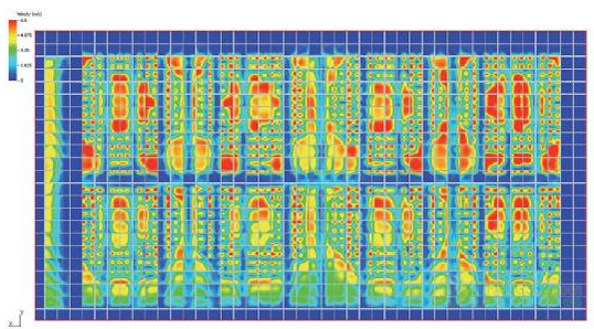 在創(chuàng)建一個組件,使每個插槽的氣流均勻統(tǒng)一之前,我們決定看看仿真模擬空氣流量,而不考慮漩渦。我們觀察到在遠(yuǎn)離風(fēng)扇75毫米的一定距離,速度變化仍然非常重要(圖8)。