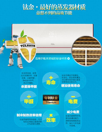 據(jù)行業(yè)內(nèi)專家介紹,由于鈦金的各項優(yōu)異性能,使得其目前已廣泛運(yùn)用于航天、醫(yī)療、船舶、涂料等許多工業(yè)中,TCL空調(diào)創(chuàng)造性地將鈦金運(yùn)用于空調(diào)行業(yè)。