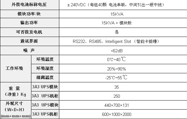 3A3UPS一個UPS模塊體積為440×700×131mm(3U),一個標準2米高的UPS機柜最多可以安裝8個UPS模塊,總容量達到120KVA,而且配電盤也含在其中,再配上與UPS機柜一般大小的電池柜,便可組成完整的UPS供電系統。由于UPS機柜和電池柜都采用標準機柜,與大多數機房的負載設備機柜一致,因此可以與負載并排放置而無需專用的UPS配電房,不僅美觀而且能為客戶最大限度地節省安裝空間。